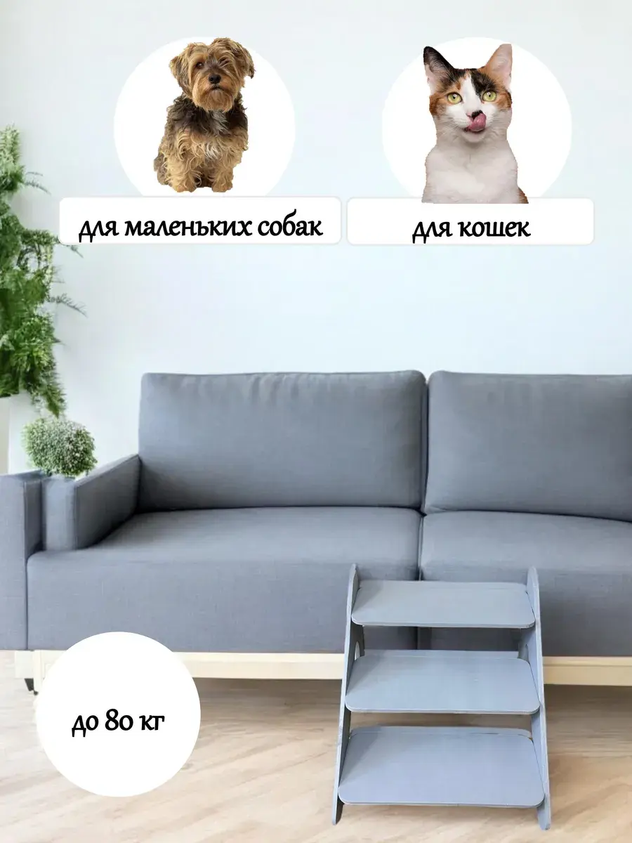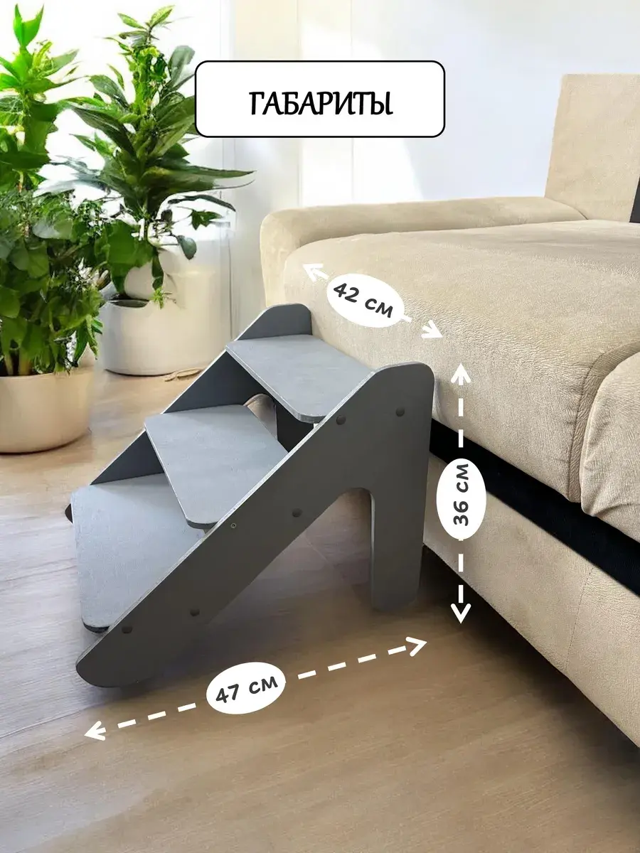 Лестница имеет оптимальную высоту 36 см и ширину ступеней 42 см , что позволяет питомцам средних и маленьких пород легко и безопасно подниматься и спускаться.