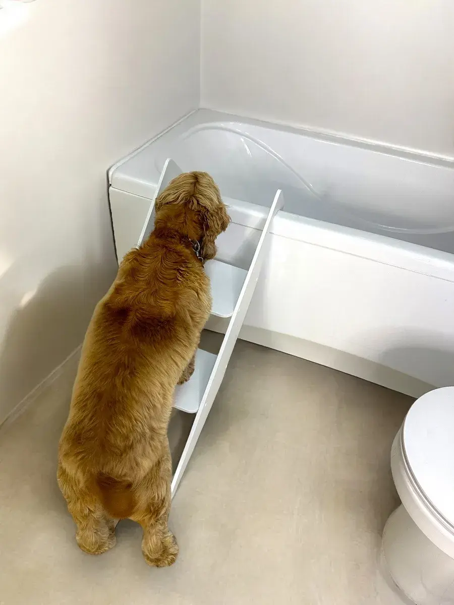 Лестница для собак средних и крупных пород в ванную от бренда бибито – идеальное решение для комфортного и безопасного использования ванной комнатой вашим любимцем. Созданная из высококачественной фанеры, эта лестница не только устойчива и долговечна, но и обладает отличными водозащитными свойствами, что делает её идеальным выбором для влажных помещений. Особенностью данной модели является её способность фиксироваться, обеспечивая стабильность и предотвращая скольжение, что добавляет дополнительную безопасность при использовании. Лестница бибито – это простой и эффективный способ помочь вашему питомцу легко подниматься и спускаться из ванны, сохраняя его комфорт и здоровье.